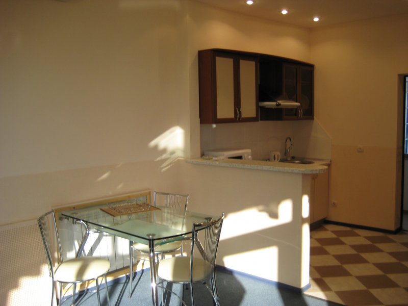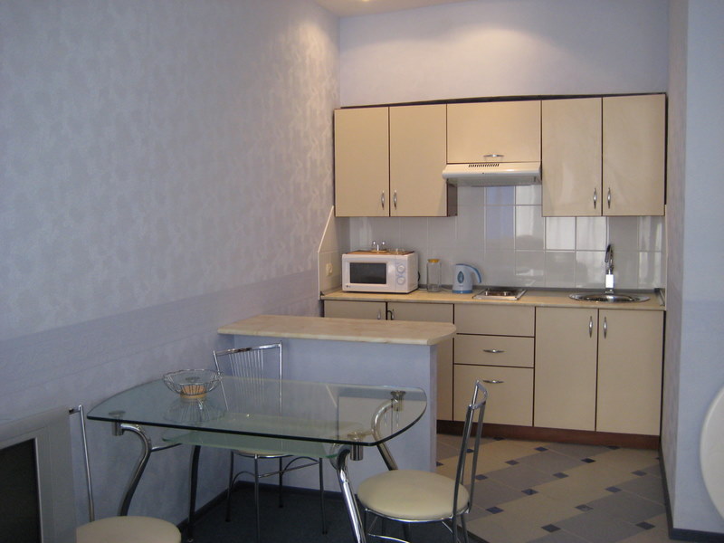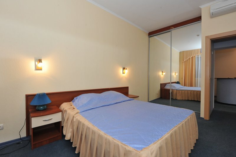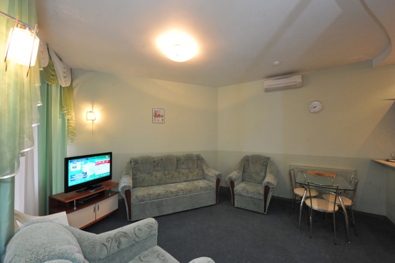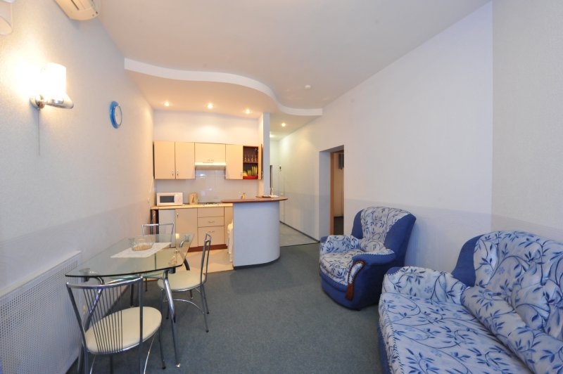 Однокомнатные апартаменты: элегантный 1-но комнатный номер с балконом. Состоит из гостиной, спальни и ванной комнаты, площадью 32 кв.м. Номер оборудован современной, комфортабельной мебелью, кровать king-size или две раздельные кровати queen-size, шкаф-купе, мягкий диван с креслом, мини-кухня с барной стойкой и укомплектованным набором посуды, TV с дистанционным пультом, холодильник. Для хранения документов, ценных вещей, денег номер оборудован специальным сейфом.