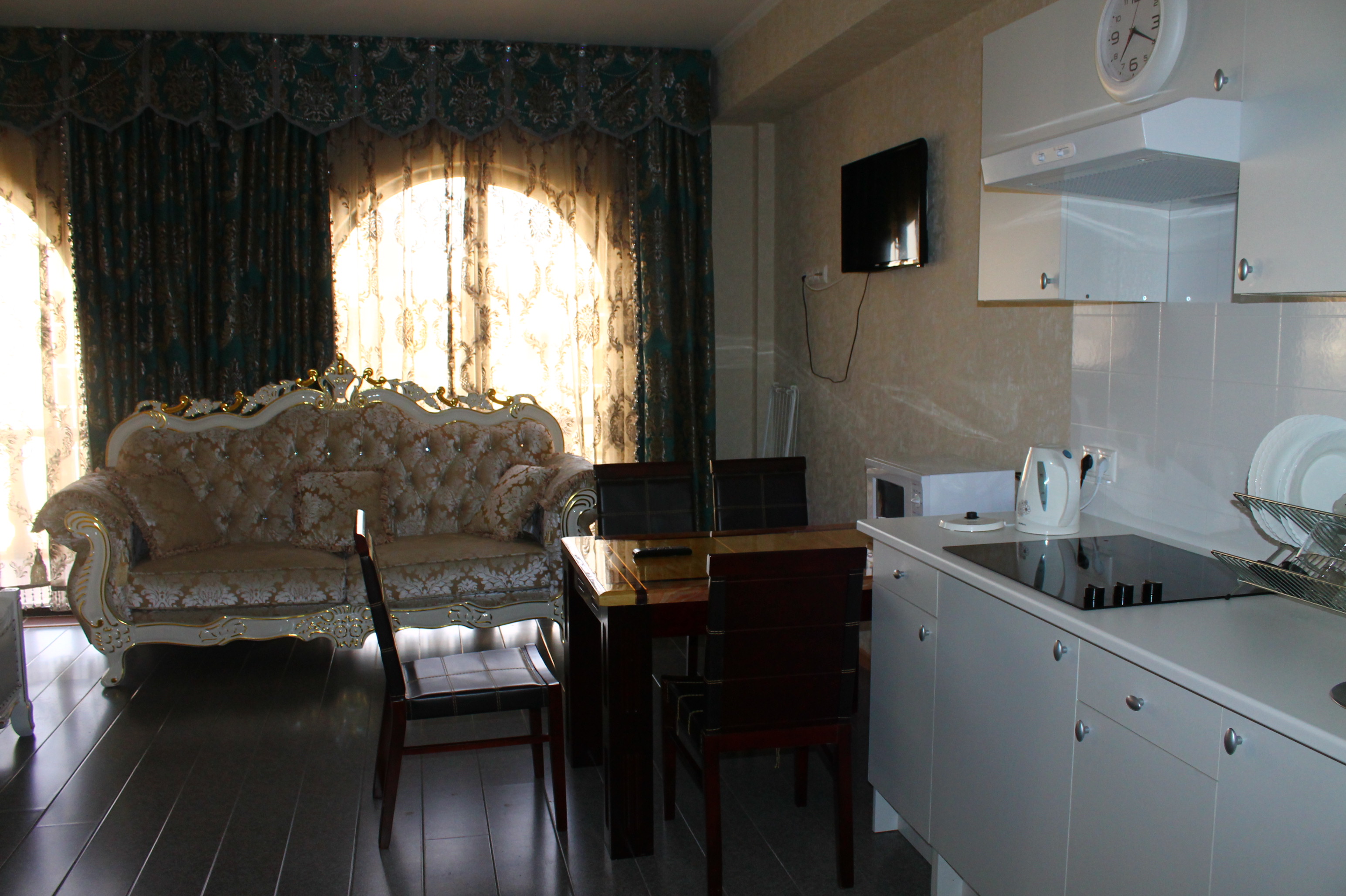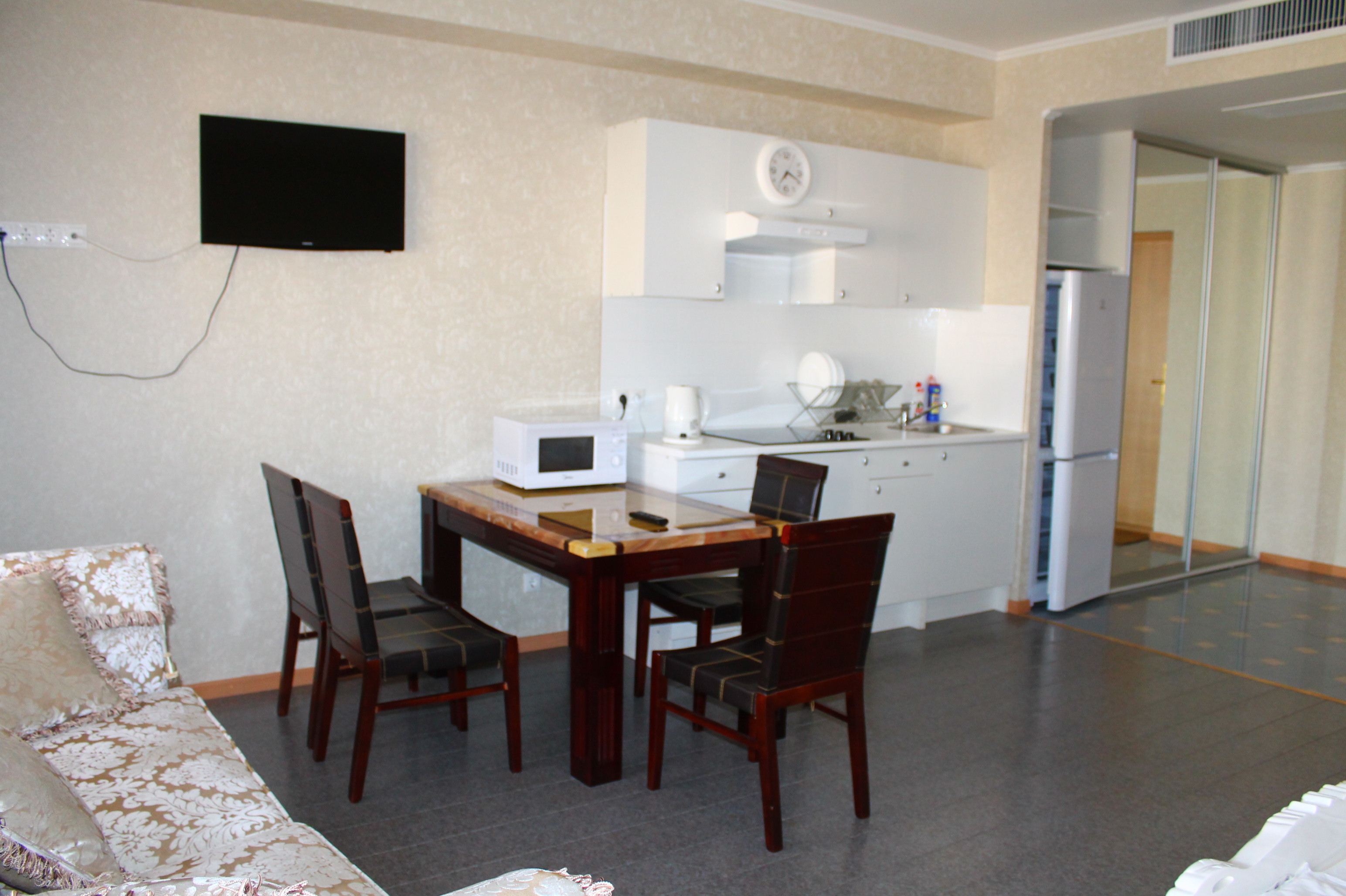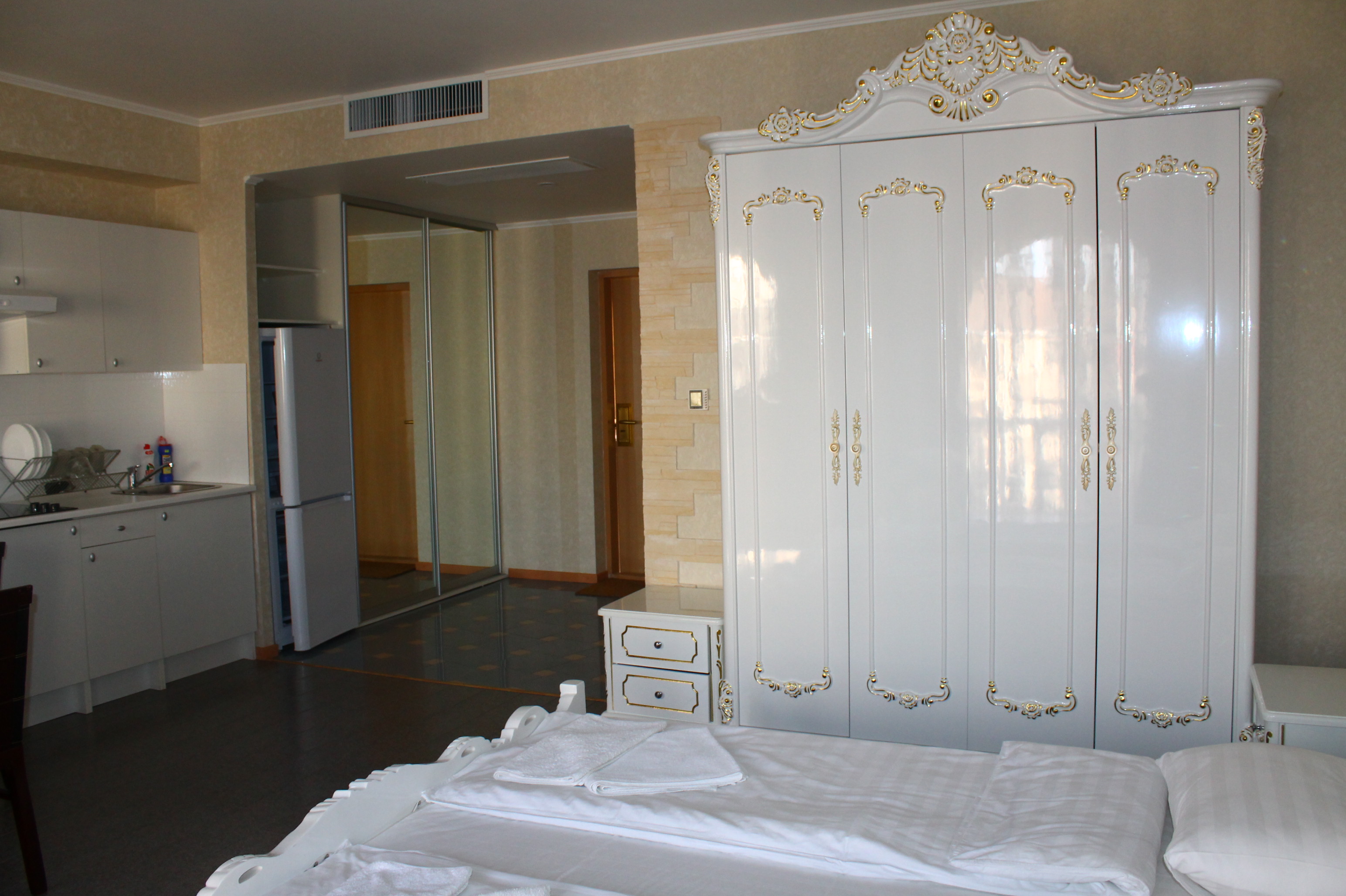элегантный однокомнатный номер с балконом. Состоит из гостиной, спальни и ванной комнаты. Номер оборудован эксклюзивной, комфортабельной мебелью, кровать king-size, диван, шкаф-купе, мини-кухня с укомплектованным набором посуды, TV с дистанционным пультом, холодильник.